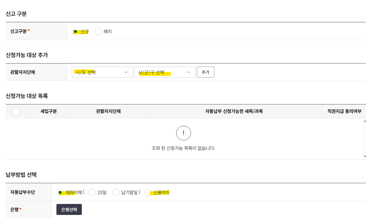 - 세목, 대상지, 기간 선택 후 신청 완료