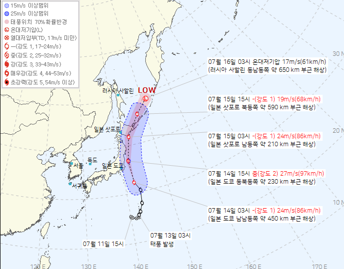 - 7월 17~19일 사이, 태풍 **나리(NARI)**의 간접 영향으로 해상 및 동해안 중심 강풍·높은 파도 우려