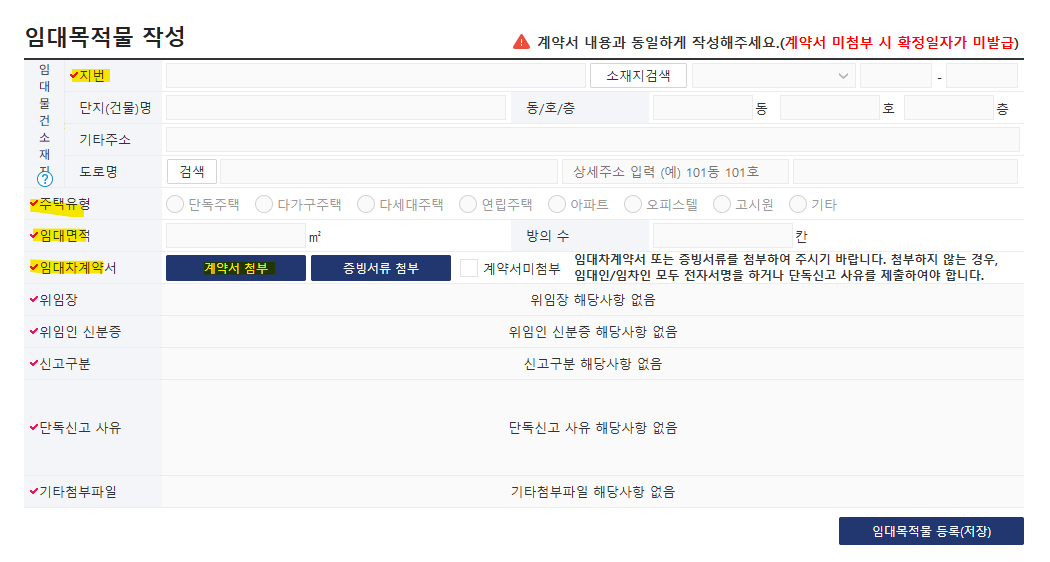 - 신고사항: 당사자 정보, 주택 주소, 보증금/월세 금액, 계약일·기간 등