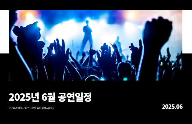 6월에도 음악과 스토리가 가득한 무대가 여러분을 기다리고 있습니다. 좋아하는 장르를 찾아 감상하며 여름을 더 풍성하게 만들어 보세요. 7월 공연 일정도 곧 업데이트 예정입니다!