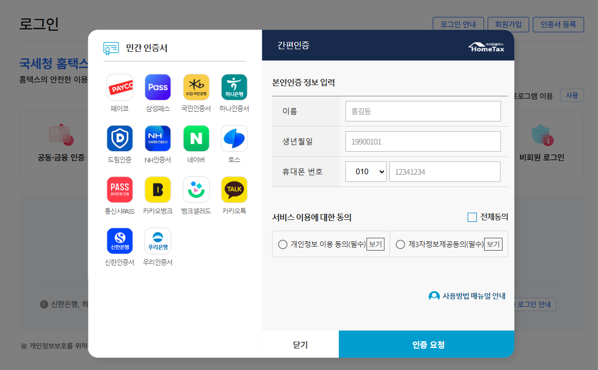 - 공동인증서 또는 민간인증서 (카카오, PASS 등)
